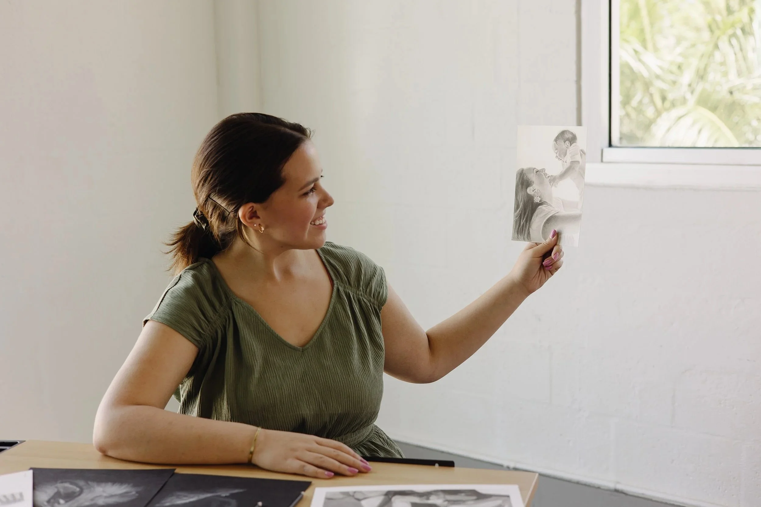 Once I receive your approved image (with the number of subjects in the photo), the size of the drawing, and half of total amount, this is where I begin to draw your personalized drawing.